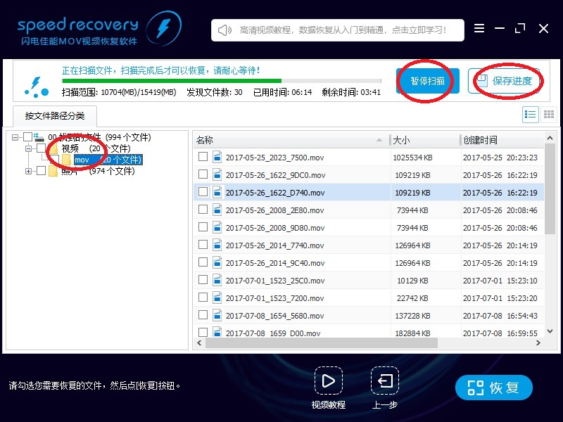 8、很快,软件就找到了很多相机拍摄的视频和照片。