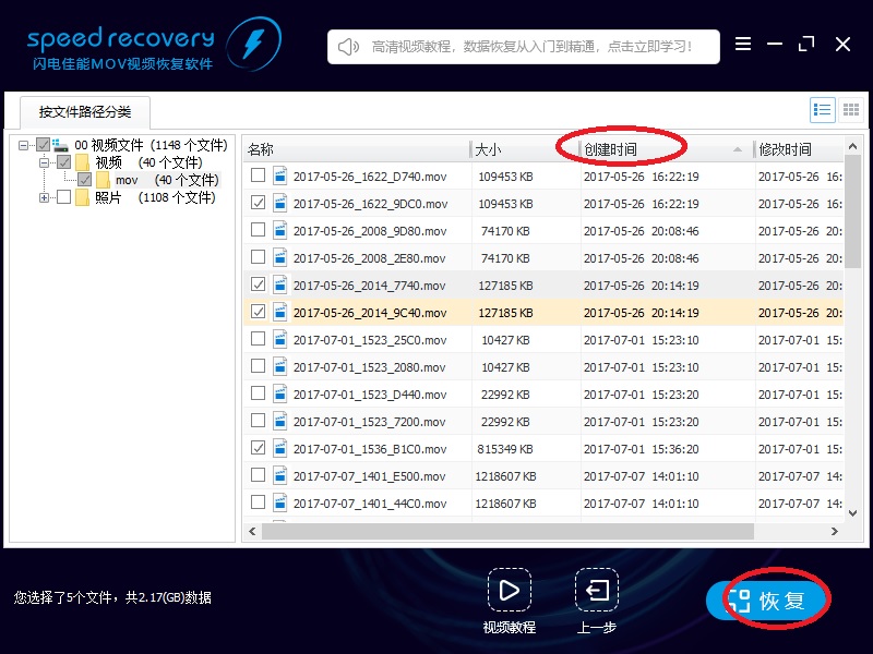 您可以点“创建时间”,视频文件就会根据视频创建视频排序,您也可以点“大小”,让文件根据大小排序,方便您找到需要恢复的视频文件。
